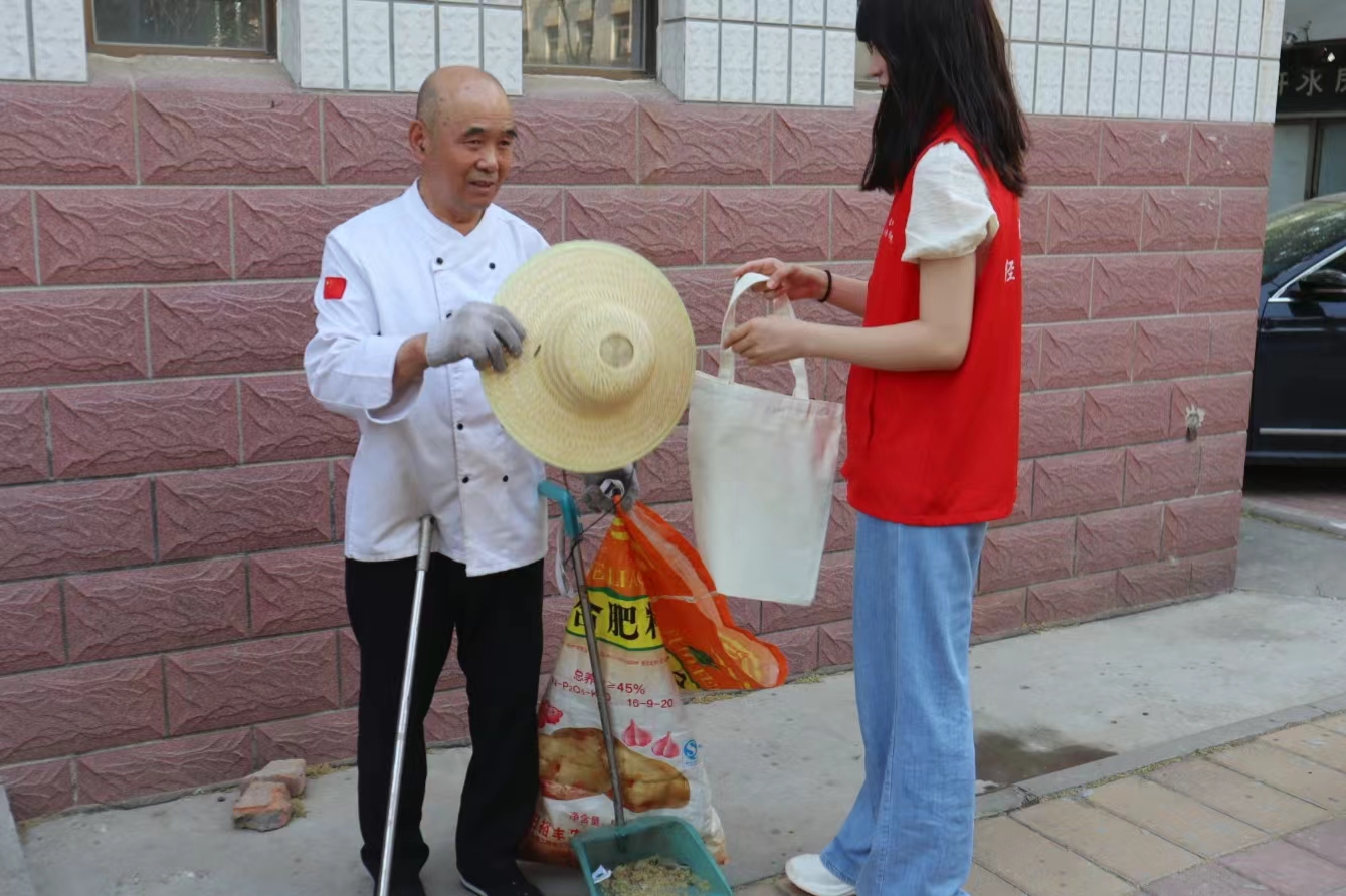 5月16日,经管志愿者在校园内寻访身边的劳动者,以亲身亲历的身边小事为素材,让学生了解一线劳动者的光荣与艰辛,向默默奉献的劳动者表示感谢。5月的天气热起来了,保洁、食堂的工作人员一直工作在炎热的一线。经管志愿者给他们送上草帽遮阳,送上帆布包方便他们携带物品,倾听他们的故事和劳动经历,为他们送上了祝福与关心,向保证校园后勤正常运行的劳动者致以敬意。