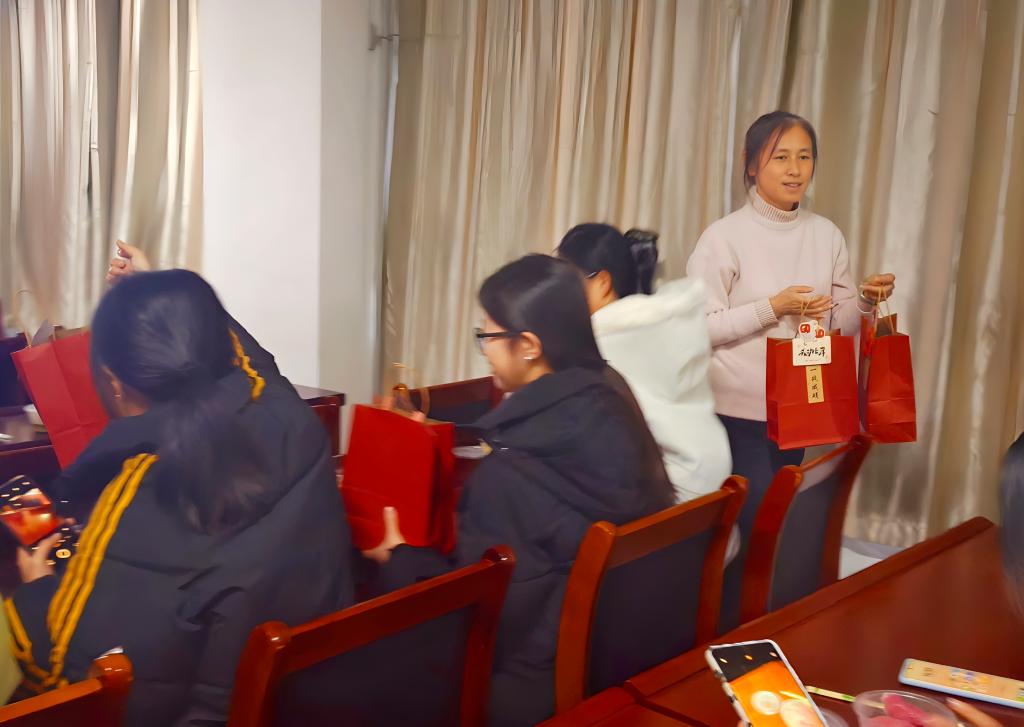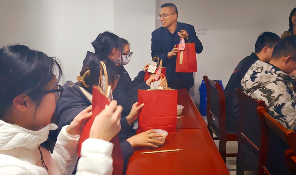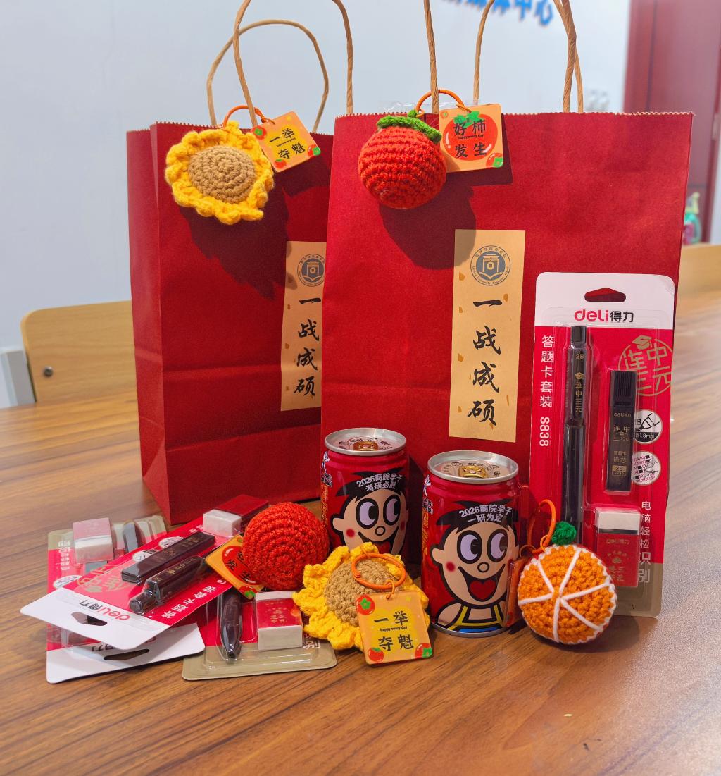 随后,学院为考研学子发放了精心准备的“暖心礼包”。每份礼包都寓意美好:旺仔牛奶象征“好运旺旺”,涂卡笔寓意“前途似锦”,编织小玩具代表“织梦未来”,幸运卡片则承载“金榜题名”的祝愿。礼物虽轻,却凝聚了全院师生对考研同学的深深关怀与殷切期望。