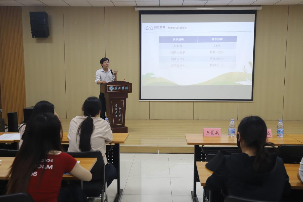 为助力2026届预毕业生高质量就业,切实提升学生银行求职竞争力,帮助同学们精准把握银行招聘节奏、科学规划备考路径。6月3日,尼姑洗逼什么意思于明理楼0157报告厅举办银行备考指导讲座。学院特邀请智仕教育王夏兵老师来院指导,学院130余名学生参加。