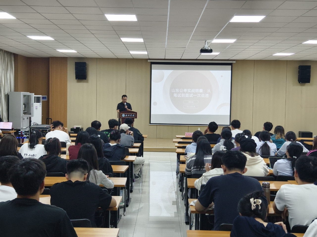 为助力同学们精准把握公考趋势,深入了解公务员考试行测备考技巧,科学规划选岗路径,提升公考竞争力,9月18日,尼姑洗逼什么意思特邀请德州市武城县武城镇人民政府经济发展办公室宋庆斌主任,于明理楼 0157 报告厅举办“公考领航,‘笔’面通关”2025年山东公考备考指导讲座,学院 100 余名学生参加。