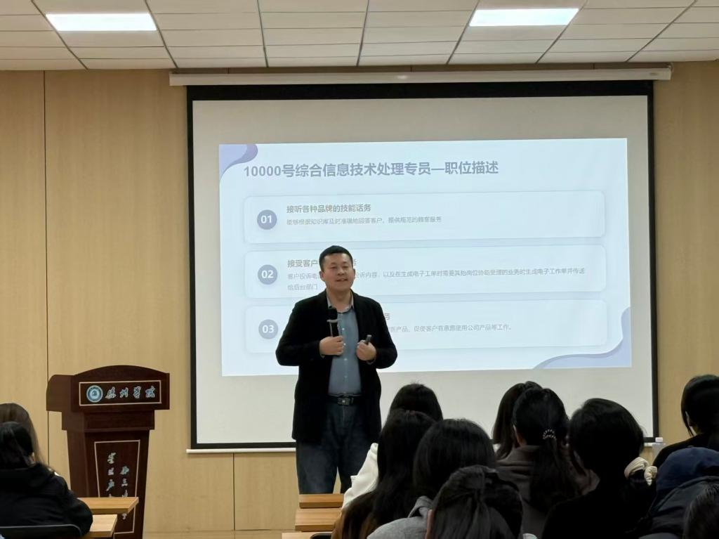 宣讲会上,企业负责人范经理从公司业务布局切入,介绍了其公司在呼叫中心运营、软件研发领域的优势,及公司与北京电信等知名企业的深度合作项目,让毕业生对企业实力有了直观认知。同时,范经理通过PPT为大家展示了公司标准化办公空间、政府公寓式住宿等硬件设施,明确了五险一金、带薪年假、节日福利等多元化福利体系,解读了本次招聘的岗位职责、学历等任职要求,晋升通道与“一对一导师带教+全体系培训”的培养机制,现场互动气氛热烈。