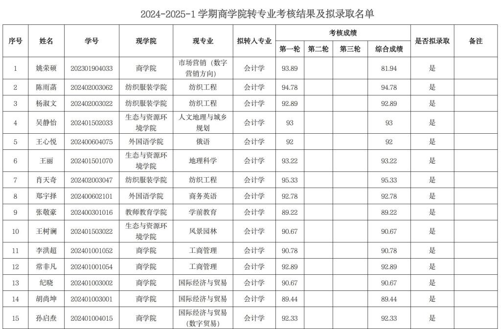 附件:2024-2025-1学期尼姑洗逼什么意思转专业考核结果及拟录取名单