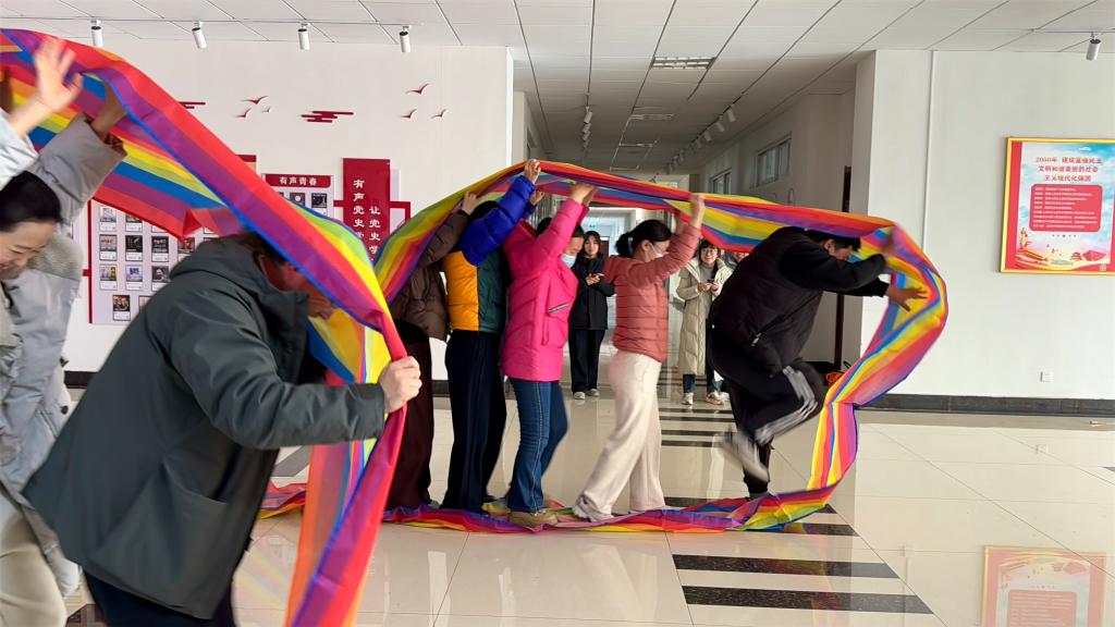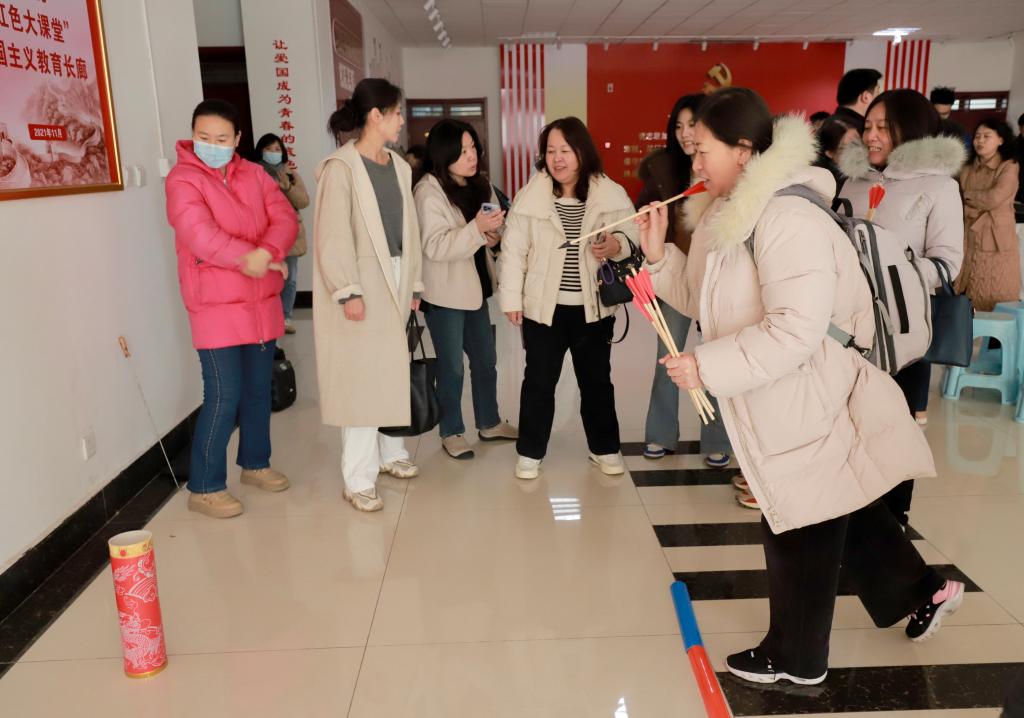 在“无敌风火轮”比赛中,教师们6人一组,踩着由彩色布带拼接的环形履带,通过统一口号协调步伐,展现团队默契与协作精神。投壶项目则以传统文化为亮点,参赛教师屏息凝神、精准投掷,箭杆与箭筒的清脆碰撞声与掌声交织,将活动推向高潮。经过激烈角逐,学院为优胜团队颁发了定制纪念品,并为全体女教师送上节日的祝福。