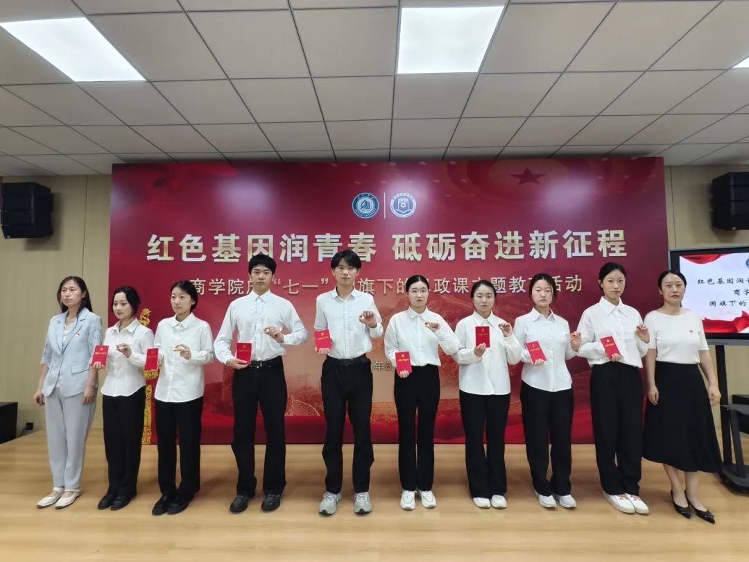 党章是立党之本,党徽是信仰之章。学院党委书记孙晨晨、院长杨颖为新发展党员颁发党章、党徽。希望他们以更高标准要求自己,发挥先锋模范作用,为党徽增光添彩。宣誓环节,全体党员庄严起立,新党员握拳宣誓,老党员重温誓词。铿锵有力的誓言既是对入党初心的再确认,更是对使命担当的再承诺。诗朗诵《诗颂风华》以激昂的语言礼赞党的百年征程,将活动推向高潮。