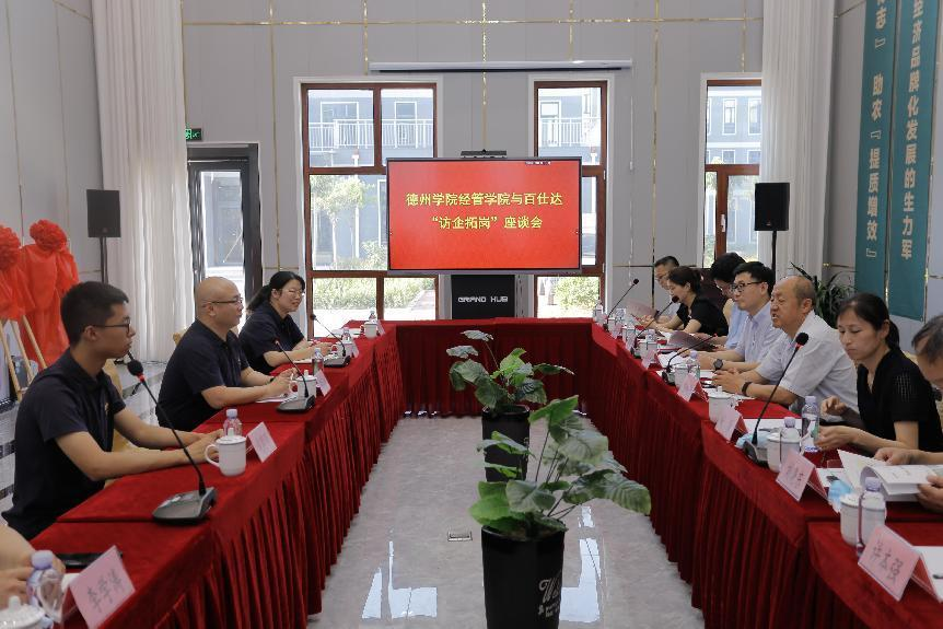 在百仕达公司参观了企业展厅,公司总经理曹成坤详细介绍了百仕达“农品”-“智农”-“农产品电商”-“大宗农产品交易” -“地标之都”-“地标小镇”六大业务模块和“1423”全产业链运营模式,在“德州味”品牌馆,对“德州味”的创建过程和品牌运营模式进行了详细介绍。在座谈会上就2022年招聘情况和实习实践等情况进行了详细介绍。他希望双方积极探索合作方式和领域,进一步加强与德州学院以及经济管理学院的全方位合作。