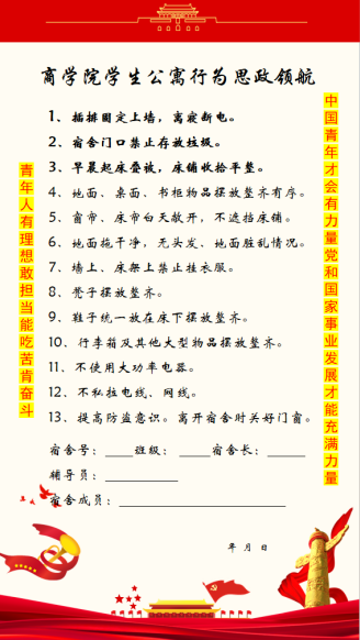 宿舍行为明白纸以红色背景为底色,两侧引用习近平总书记对青年的殷切嘱托“青年人有理想、敢担当、能吃苦、肯奋斗,中国青年才会有力量,党和国家事业发展才能充满力量”,其内容条例的制定充分征集了学院宿舍楼长查寝情况的反馈,并在部门成员共同讨论后结合实际情况进行完善,分别从卫生、安全等多方面对同学们做出了要求,引导同学们自律、自洁、自强。