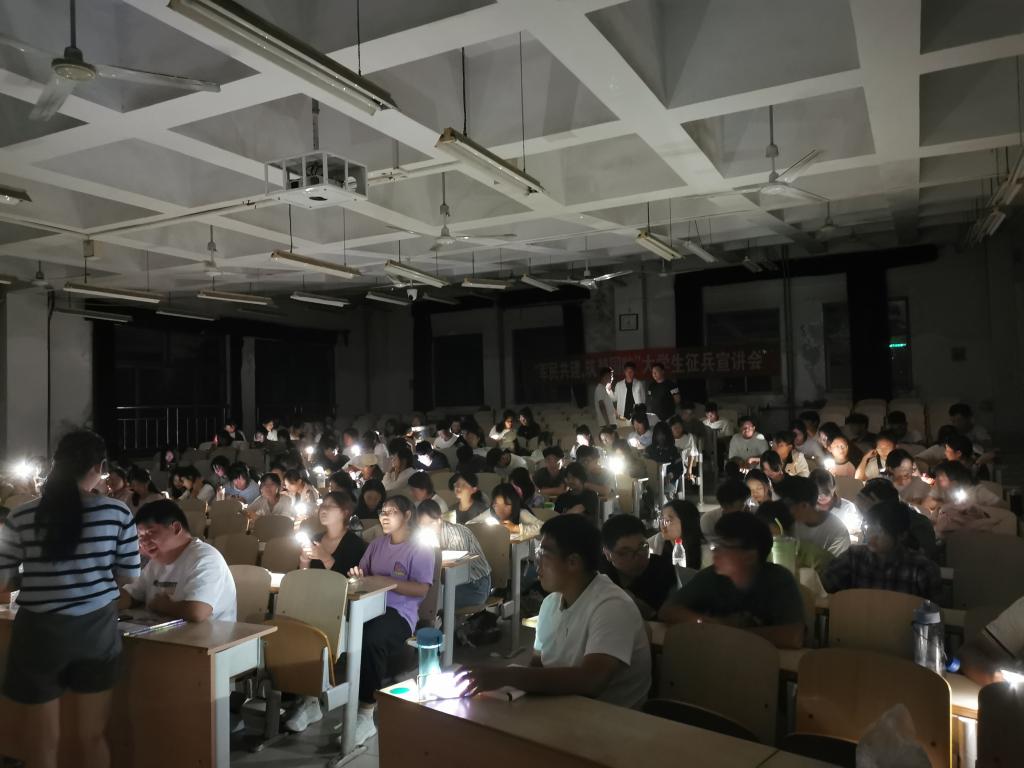 宣讲会进行的过程中突然遭遇断电,同学们自拿出手机照明,仍然热心听讲,积极咨询。