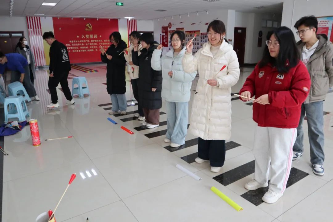 紧接着,“投壶”游戏带领同学们穿越时空,体验了一把古代传统游戏的魅力。同学们手持箭矢,全神贯注地瞄准壶口投掷,每一次成功投中都赢得了阵阵喝彩。即便未能投中,同学们也毫不气馁,迅速调整状态再次尝试,展现了良好的心理素质和竞技精神。